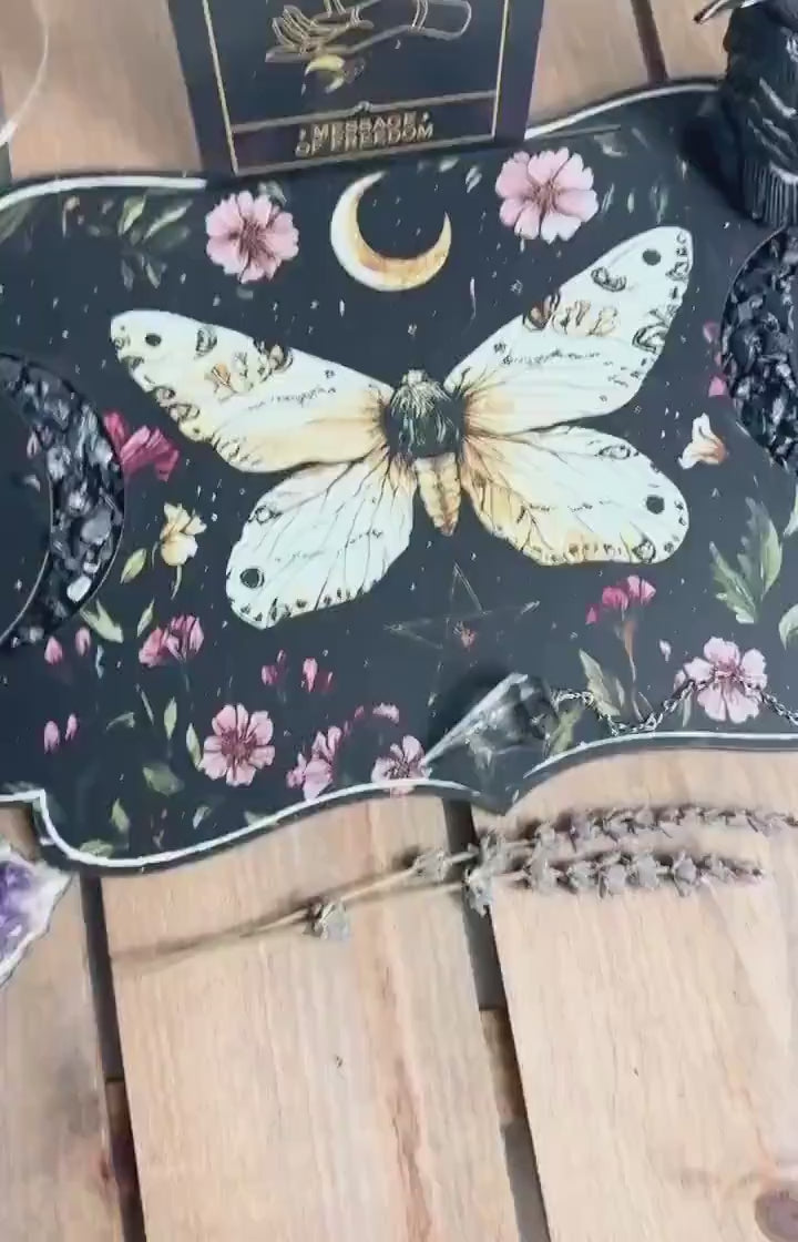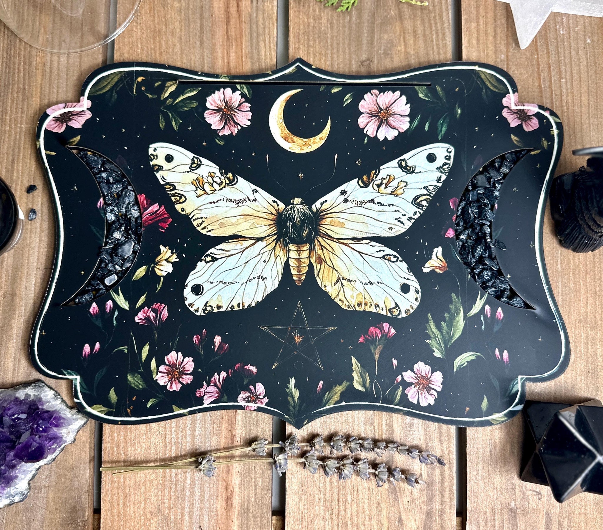 Alter peice| Card + trinket holder| Sacred Space Wooden printed alter piece | floral moth with pentagram