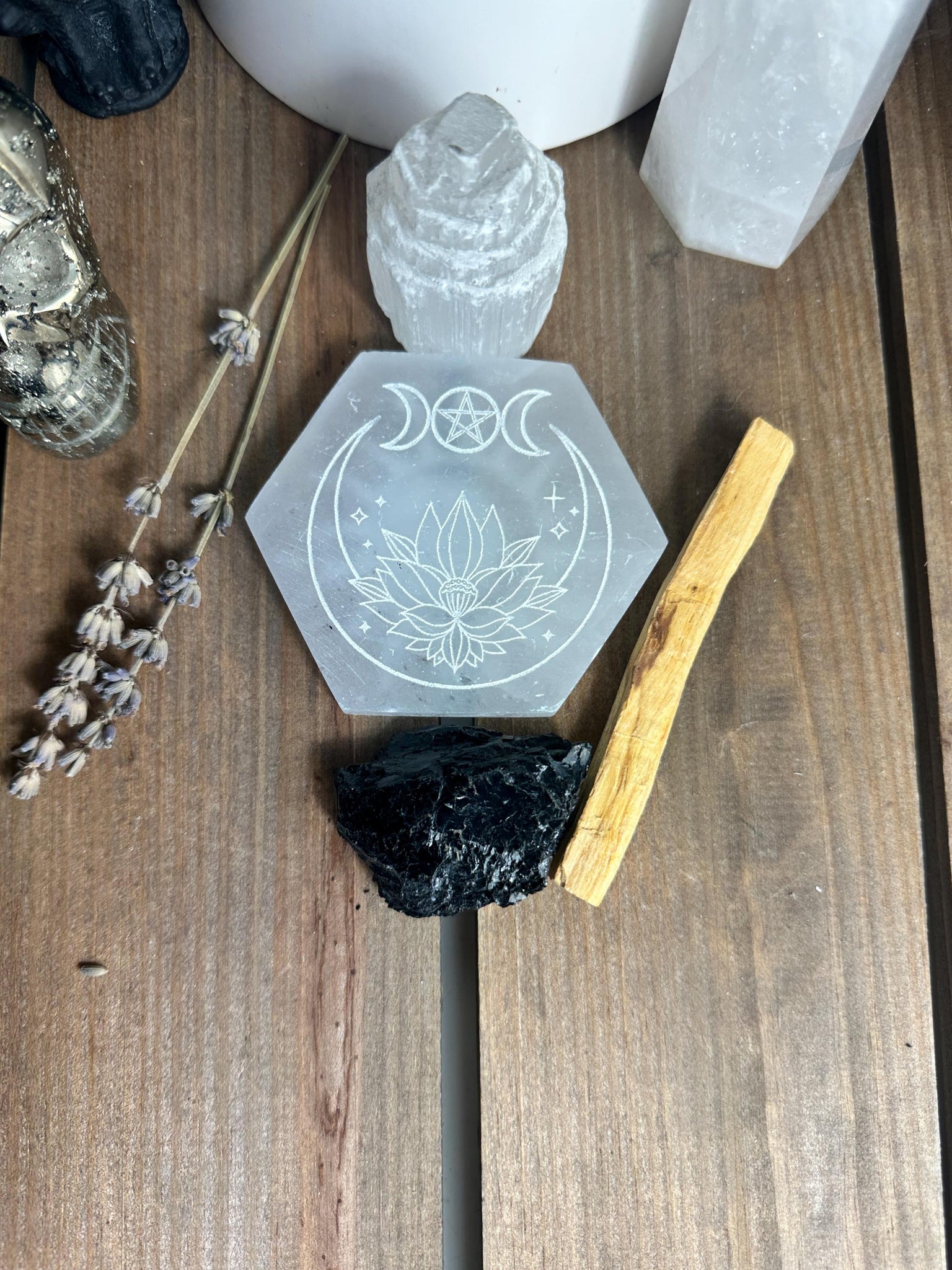 Selenite Tower 6cm x raw black, hexagon selenite charging plate Tourmaline, Palo Santo House Protection Kit